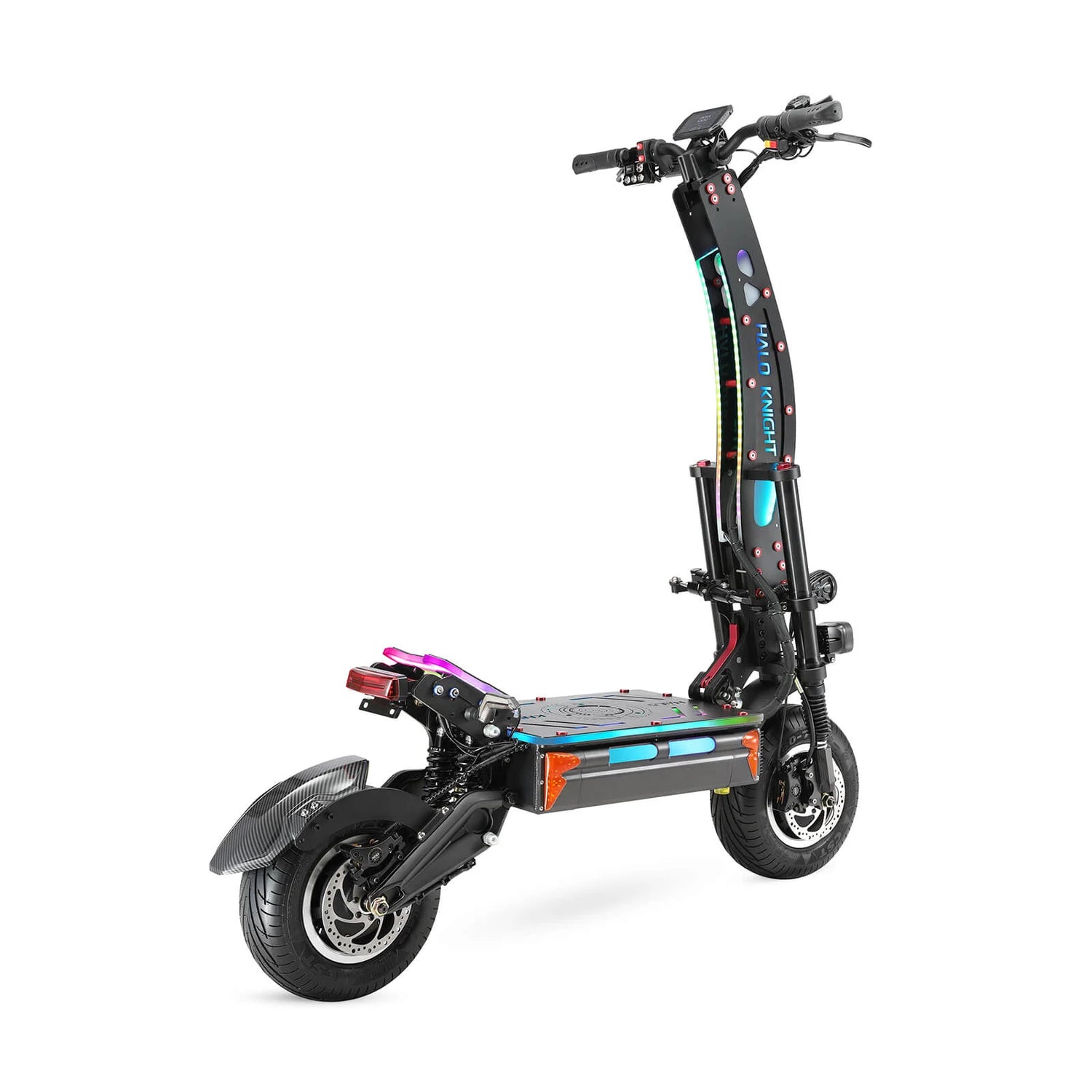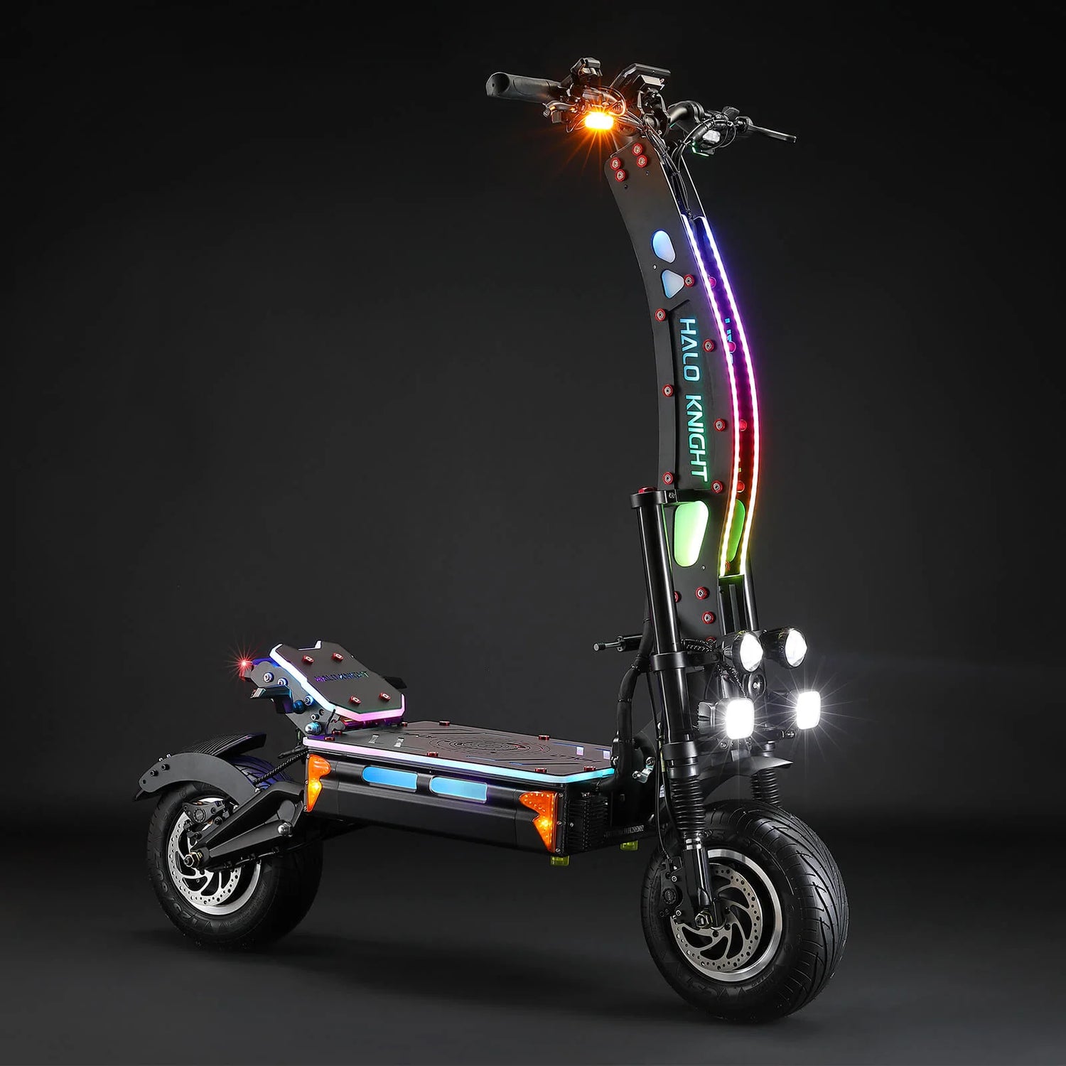 Doté d’un ensemble complet d’éclairage professionnel : Lumières carrées, Lampes Apollo, Phares haute/low beam, Lumières clignotantes, Lumières double flash, Clignotants avant/arrière, Lumières de moyeu, Lumières d’angle, Lumières de conduite, Lumières de frein et lumières RGB full-body (pour le montant, la plateforme et le repose-pied) – tous contrôlables via une télécommande. Son design artistique et ses belles lumières créent une expérience de conduite tendance.