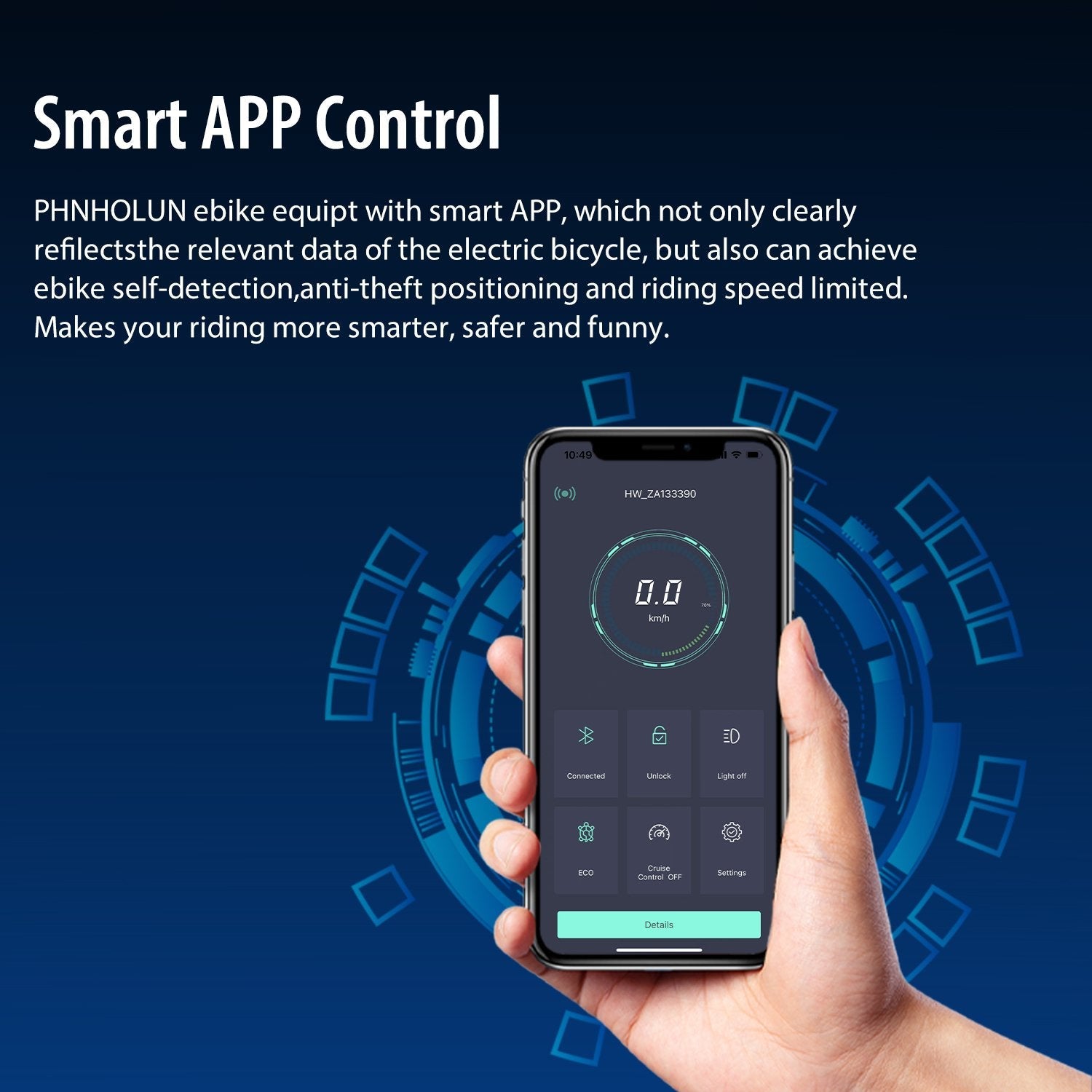 L'application mobile vous donne un contrôle total sur votre vélo électrique. Vous pouvez allumer et éteindre le vélo, activer la croisière pour une balade relaxante et consulter les données importantes de votre parcours en temps réel. Prenez le contrôle de votre expérience de conduite avec notre application pratique et conviviale.