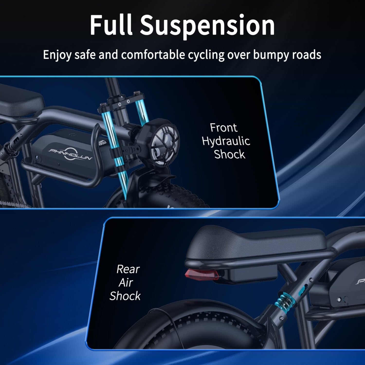 Le modèle C8 incarne le summum des performances en matière de vélo électrique. Il est équipé d'un puissant moteur de 1000 W, d'une batterie amovible de 48 V 20 Ah avec une autonomie de 80 à 120 km et d'une transmission Shimano à 21 vitesses pour tous les terrains. Ses pneus tout-terrain de 20 × 4,0 pouces offrent une excellente adhérence, tandis que les suspensions avant et arrière assurent une conduite en douceur. Un phare avant lumineux et un feu arrière de freinage augmentent la sécurité, tout comme une application qui vous permet de contrôler le vélo. Enfin, le porte-bagages arrière robuste ajoute une dimension pratique.