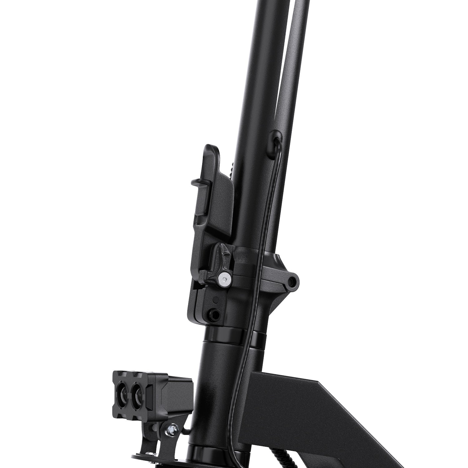 Roues avant et arrière équipées d'amortisseurs renforcés. Tests montrent 55% de vibrations en moins sur nids-de-poule de 8cm à 25km/h comparé aux modèles sans suspension. Réduction des vibrations main à 33% des trottinettes classiques, permettant 2h de conduite continue sans fatigue.